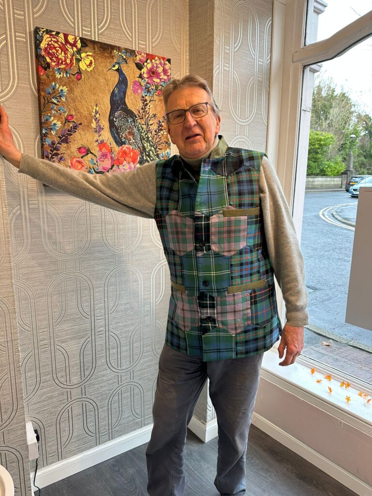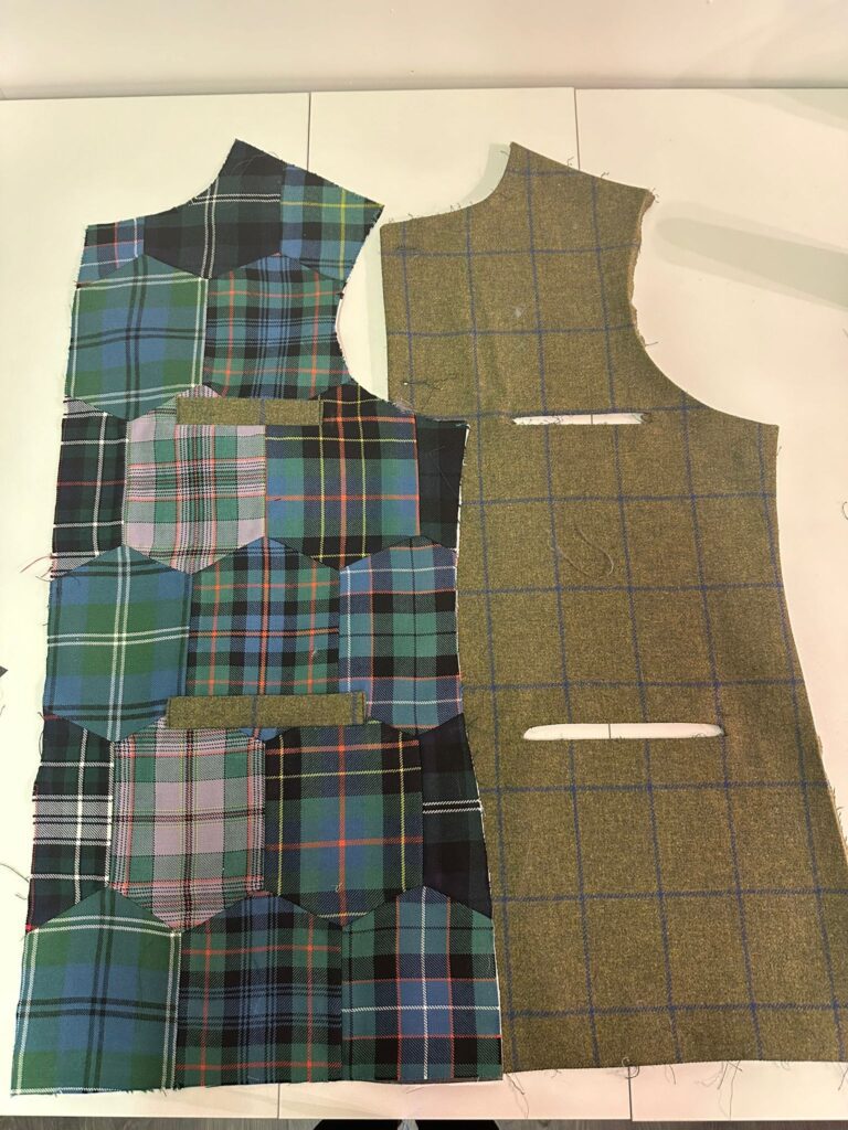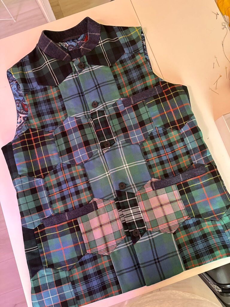 Each tartan held meaning, so every panel had to be positioned with precision, ensuring the colours, lines, and history of each clan were respected. We carefully cut, matched, and assembled the fabrics, crafting a waistcoat that not only looked balanced but carried the story of his family in every seam.
